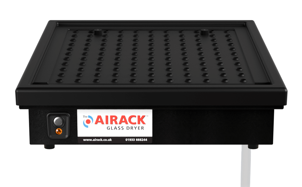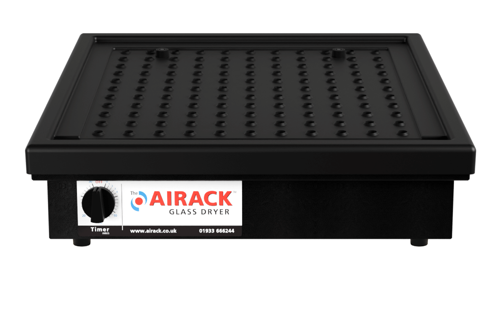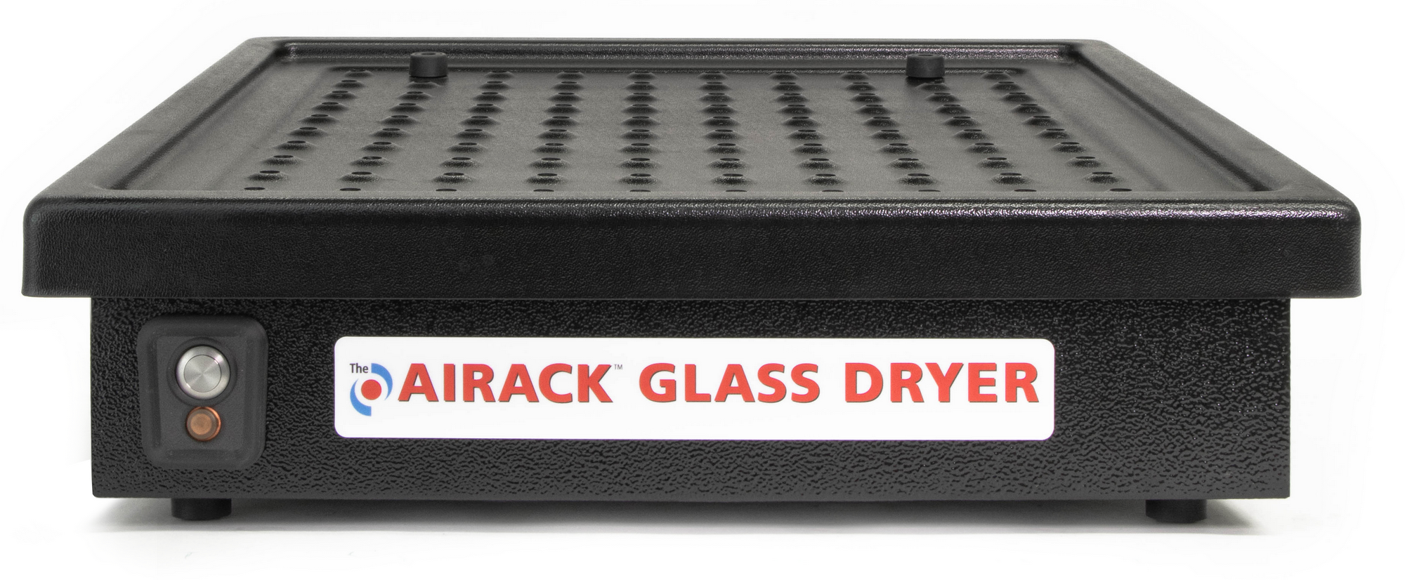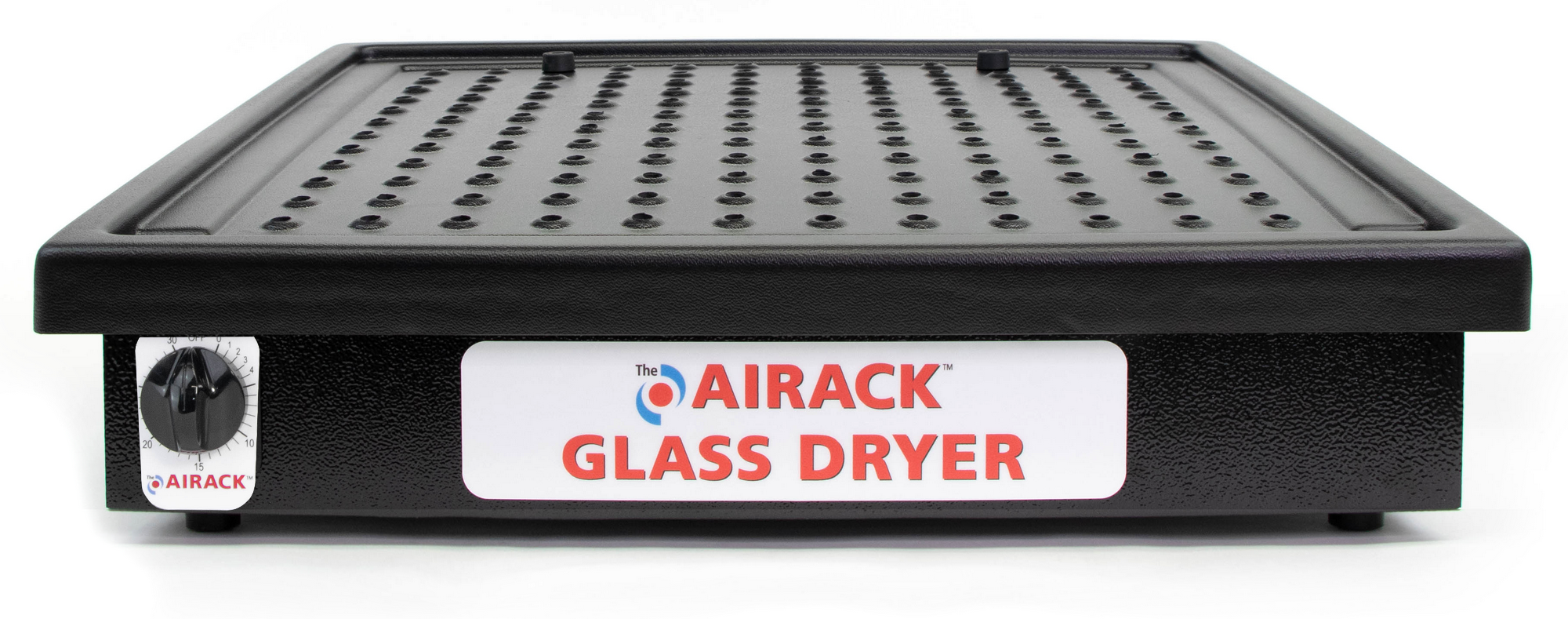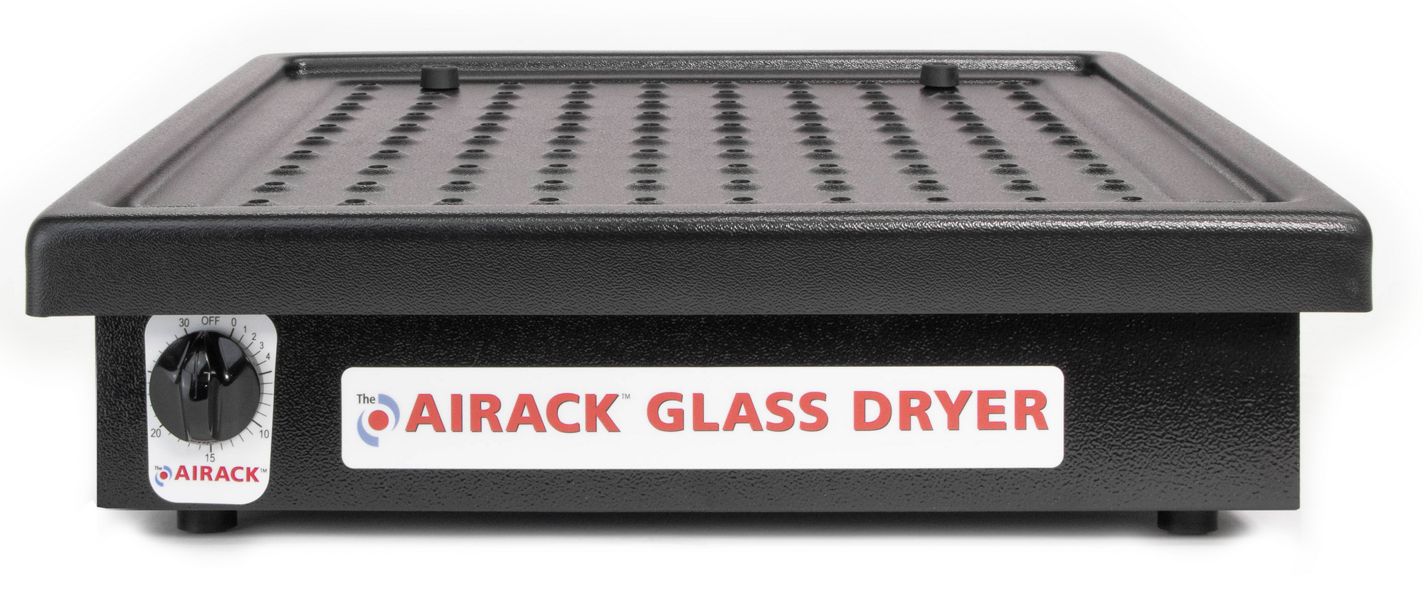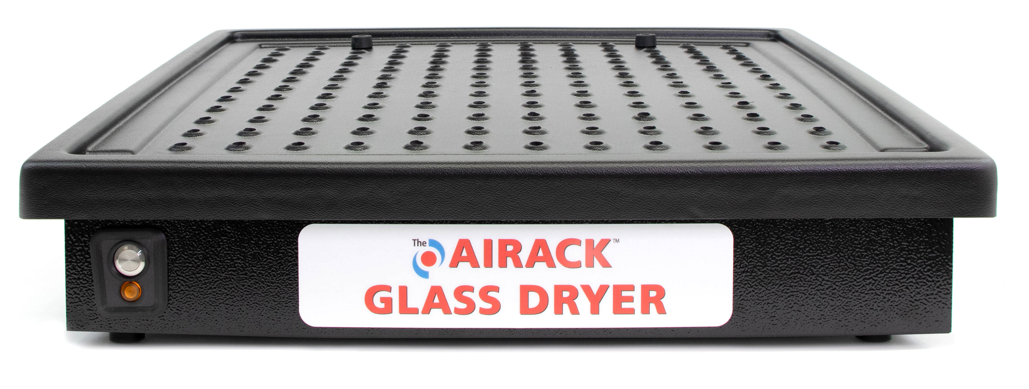 The Airack Standard is perfect for your glassware and set up based on your answers. This Airack comes with a four-minute electronic timer that automatically shuts off after the cycle. This Airack also comes with a drain funnel tube for the removal of excess water and a changeable airflow filter pad.